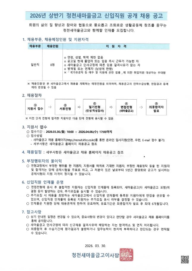 2026³â »ó¹Ý±â ûõ»õ¸¶À»±Ý°í ½ÅÀÔÁ÷¿ø °ø°³°æÀï ä¿ë °ø°í